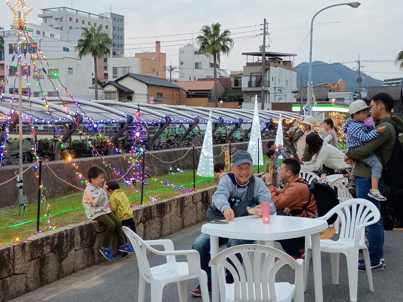 11月8日㈯三原内港に点灯式に明るい内から、白玉ぜんざいプレゼントに多くのファミリーが並んでくださり、にぎやかでした。ピザ窯でのピザ販売やかねしょうさんのfoodなど。また手作り工作や射的で楽しんでもらいました。点灯期間 2026年2月末まで点灯時間 16時〜22時30分まで