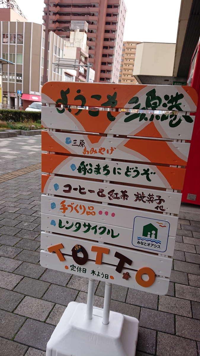 新しい看板がお迎えします。片面が英語版 日本語版になっています。兎の形が分かりますか?お待ちしています。 みなとオアシス三原