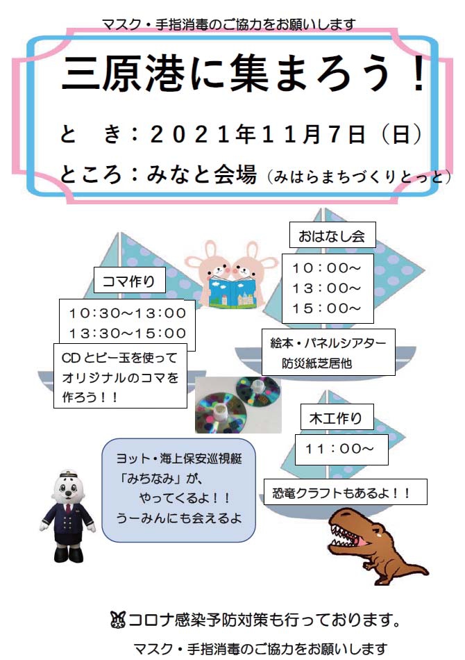 11月7日(日)は三原港に集まろう!おはなし会、木工作成、海上保安パネル展示などなど…ぜひお誘いあわせのうえお越しください!