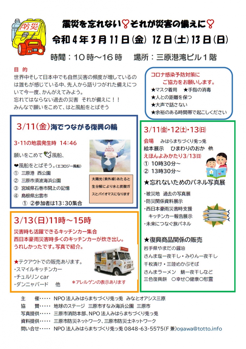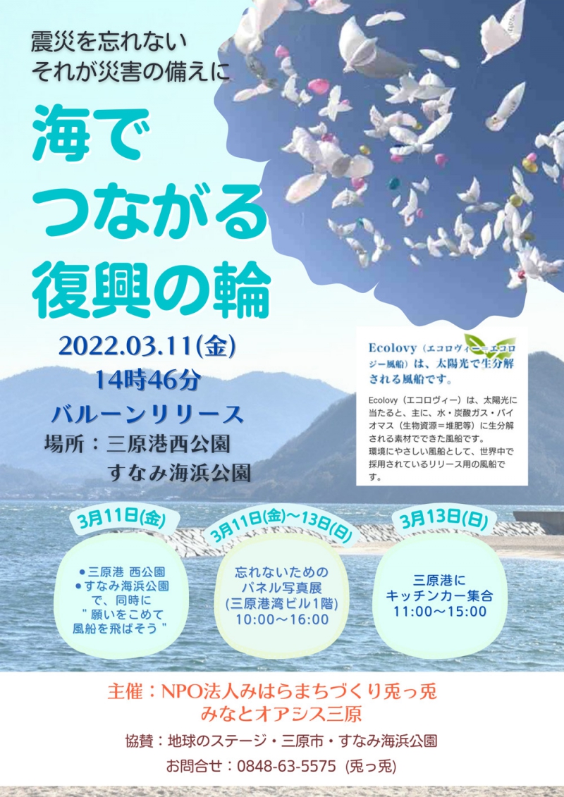 3月11日㈮ バルーンリリース3月11日㈮〜13日㈰まで 忘れないためのパネル写真展 復興支援物資販売 被災地絵本 読み語り(13日㈰のみ)3月13日㈰ 三原港にキッチンカー集合 西日本豪雨災害の時に支援してもらいました。 災害時に発揮できるキッチンカー 今回三原のキッチンカーが集合 テイクアウトで販売します。