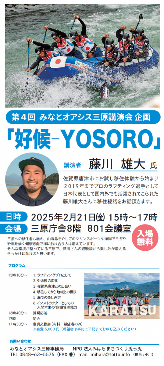 プロのラフティング選手として国内外で活躍してこられた藤川雄大氏を講師にお招きし、移住秘話をお話しいただきます。入場無料です。ぜひご来場ください。