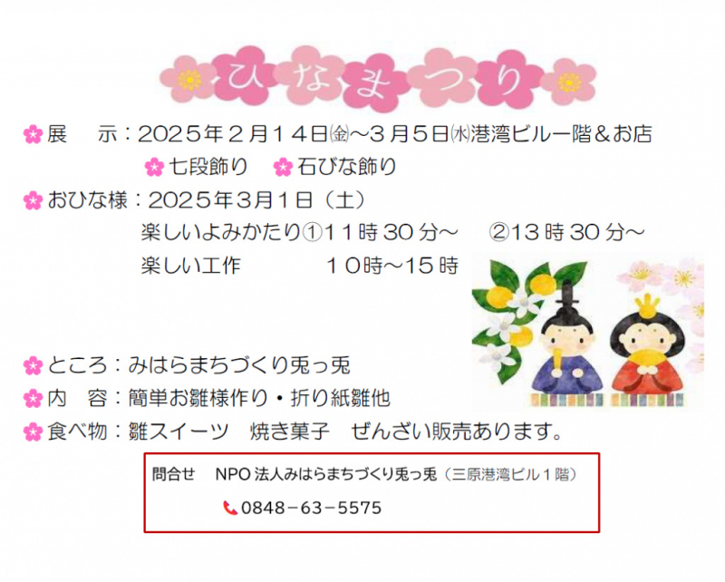 みはらまちづくり兎っ兎にて、7段飾り、石びな飾り、よみかたり、工作などを行います。ぜひお越しください。