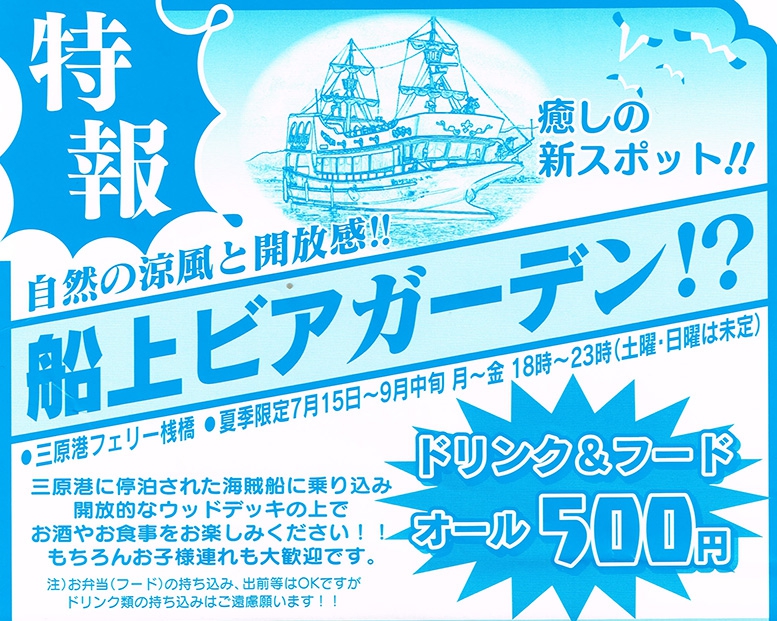 自然の涼風と開放感!癒しの新スポット!場所:三原港フェリー桟橋日時:7月15日〜9月中旬 月〜金18:00〜23時(土曜・日曜は未定)解放的なウッドデッキの上でお酒やお食事をお楽しみください。もちろんお子様連れも大歓迎です。ドリンク&フード オール500円注)お弁当(フード)の持ち込み、出前等はOKですがドリンク類の持ち込みはご遠慮願います。連絡先:しまなみビスタクルーズ TEL0845-27-0355
