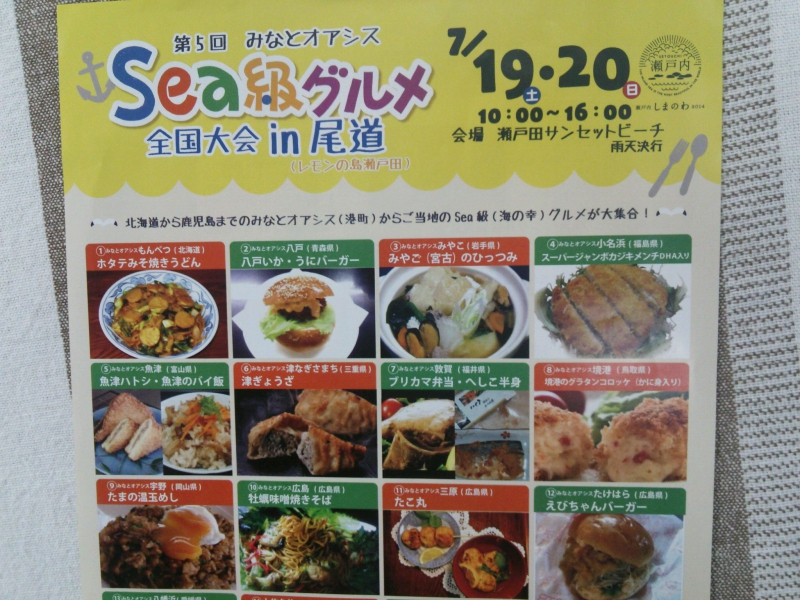 日時 7月19日土曜日 10:00〜16:00 20日日曜日 10:00〜16:00会場 瀬戸田サンセットビーチ 雨天決行主催/みなとオアシスSea級グルメ全国大会尾道実行委員会・ みなとオアシス全国協議会公式サイトホームページをご覧ください。http://mo-setoda.net/seaq-gourmet/みなとオアシス三原も「たこ丸」で出場します。