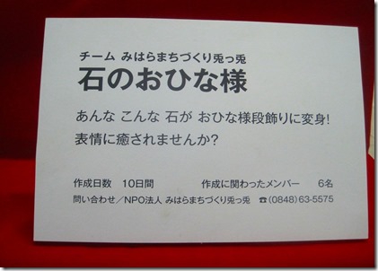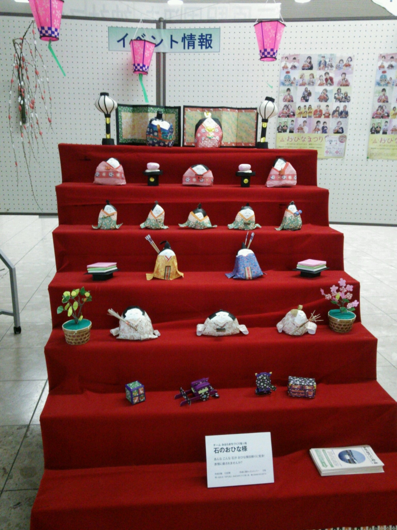三原駅周辺から港会場までおひな様でお出迎えみなとオアシス三原 拠点でもメインイベント 2月28日 3月1日とお出迎えします。詳しくは三原観光協会を検索ください。三原駅コンコースにはみはらまちづくり兎っ兎のメンバーで作成した石のおひな様段飾りを展示しています。