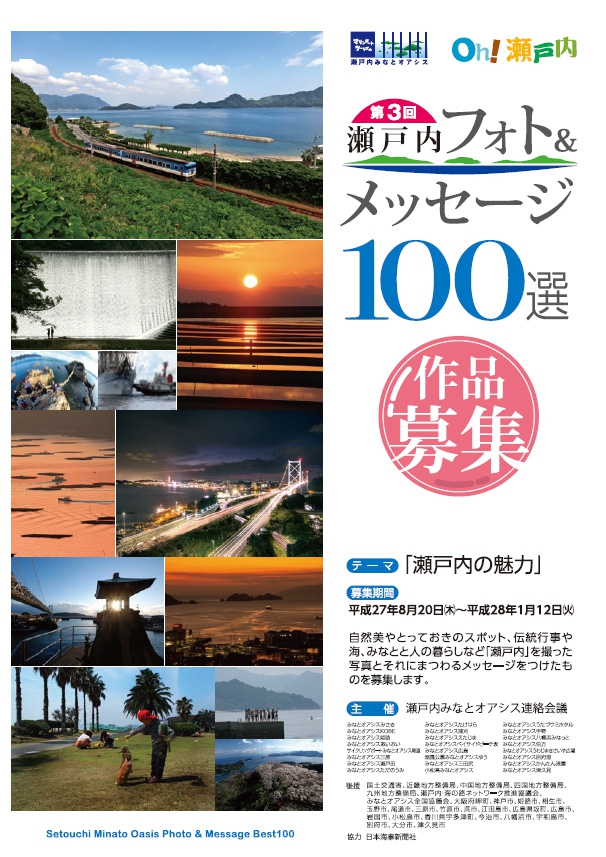 自然美やとっておきのスポット、伝統行事や海、みなとと人の暮らしなど、「瀬戸内」を撮った写真とそれにまつわるメッセージを付けたものを募集いたします。【募集期間】 平成27年8月20日(木)〜平成28年1月12日(火)【主催】瀬戸内みなとオアシス連絡協議会⇒詳しくはこちらのPDFをご覧ください