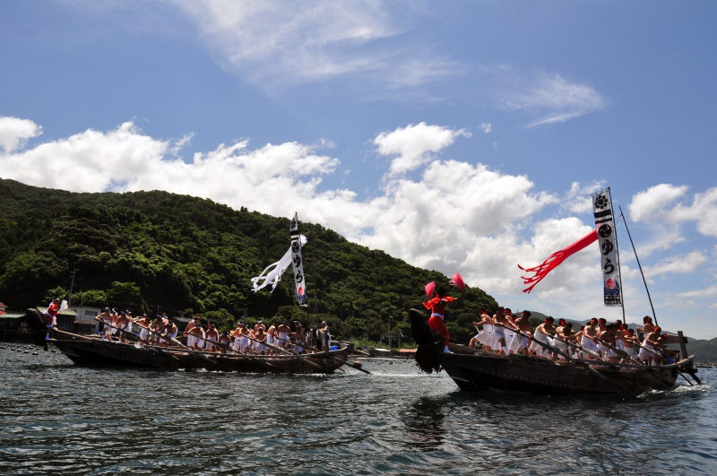 宇和島市津島町下灘地区の由良神社夏祭りの和船競漕です。10丁の櫂を漕いで競い合います。