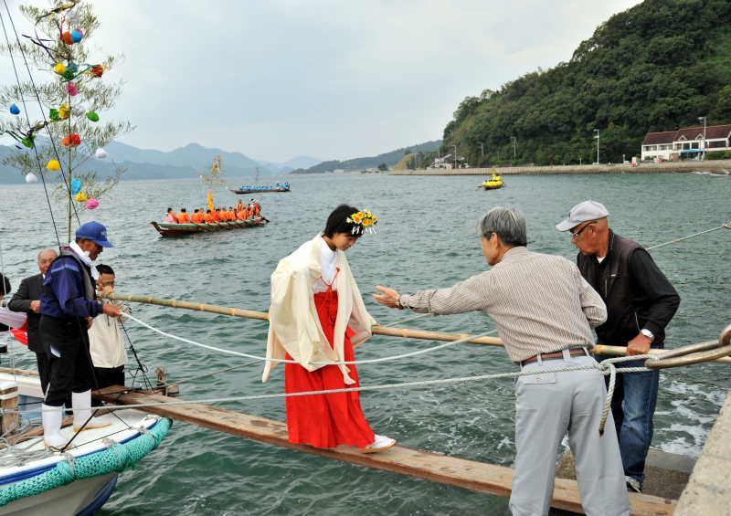 御座船から下船する御子さん少し怖いがこれから神事があります。