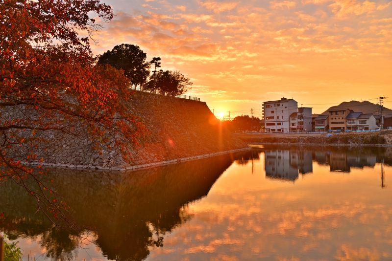 1567年小早川隆景公により、瀬戸の小島を結び三原城(浮城)が築城されました。後に天守台石垣と堀は三原のシンボルとして今も残り、11月三原浮城まつりの頃、秋の夕日は堀と石垣、紅葉を赤く染めとてもきれいです。