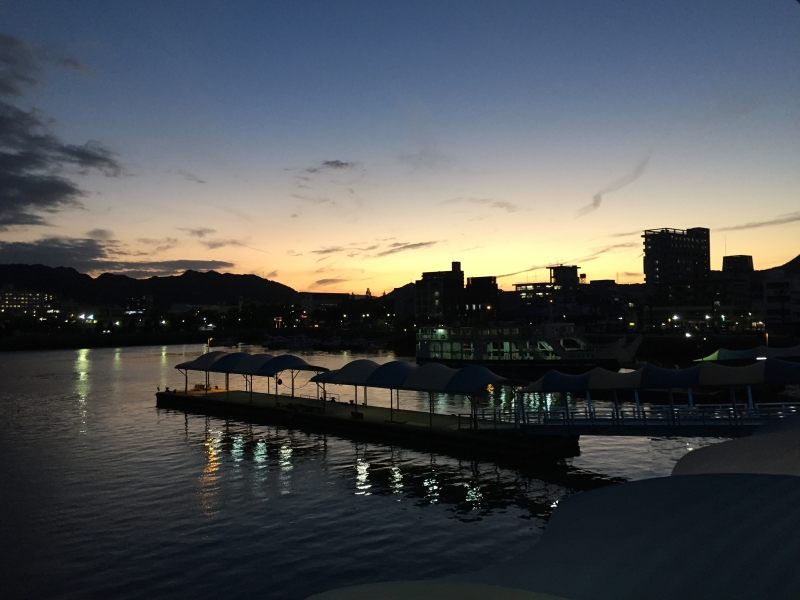 三原港に船がやってくると一面に波が立ち大きな夕焼け空を映しながら揺れていた。