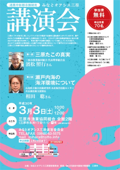講演会を開催します。三原たこの真実 濱松照行さん瀬戸内海の海洋環境について 相田聡さん